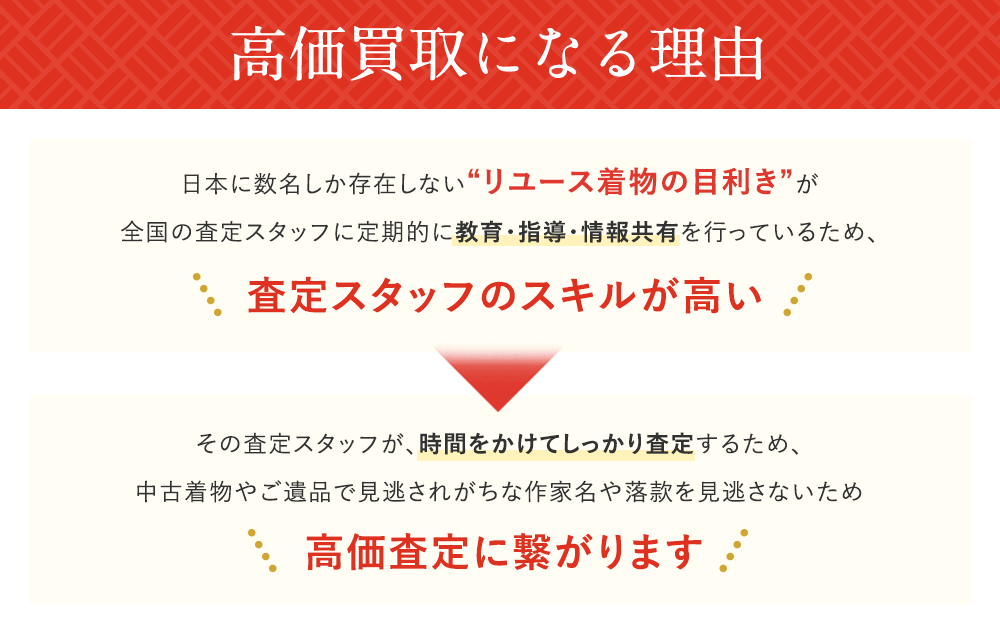 また、日本に数名しか存在しない"リユース着物"の目利きが全国の査定スタッフに定期的に教育・指導・情報共有を行っているので、査定スタッフのスキルが高く高価買取されやすいです。